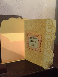 I used Anna's Flourish Cards and Embellishments in Design Studio from Cricut. The card measures approximately 5 X 7. I used Close to My Heart papers, with the Damask Close To My Heart embossing folder. The sentiment is written with the Cricut explore using their .03 black pen. This was attached to the medallion, in Design Space, that was also from the same Anna's Cartridge. I really like the cartridge.