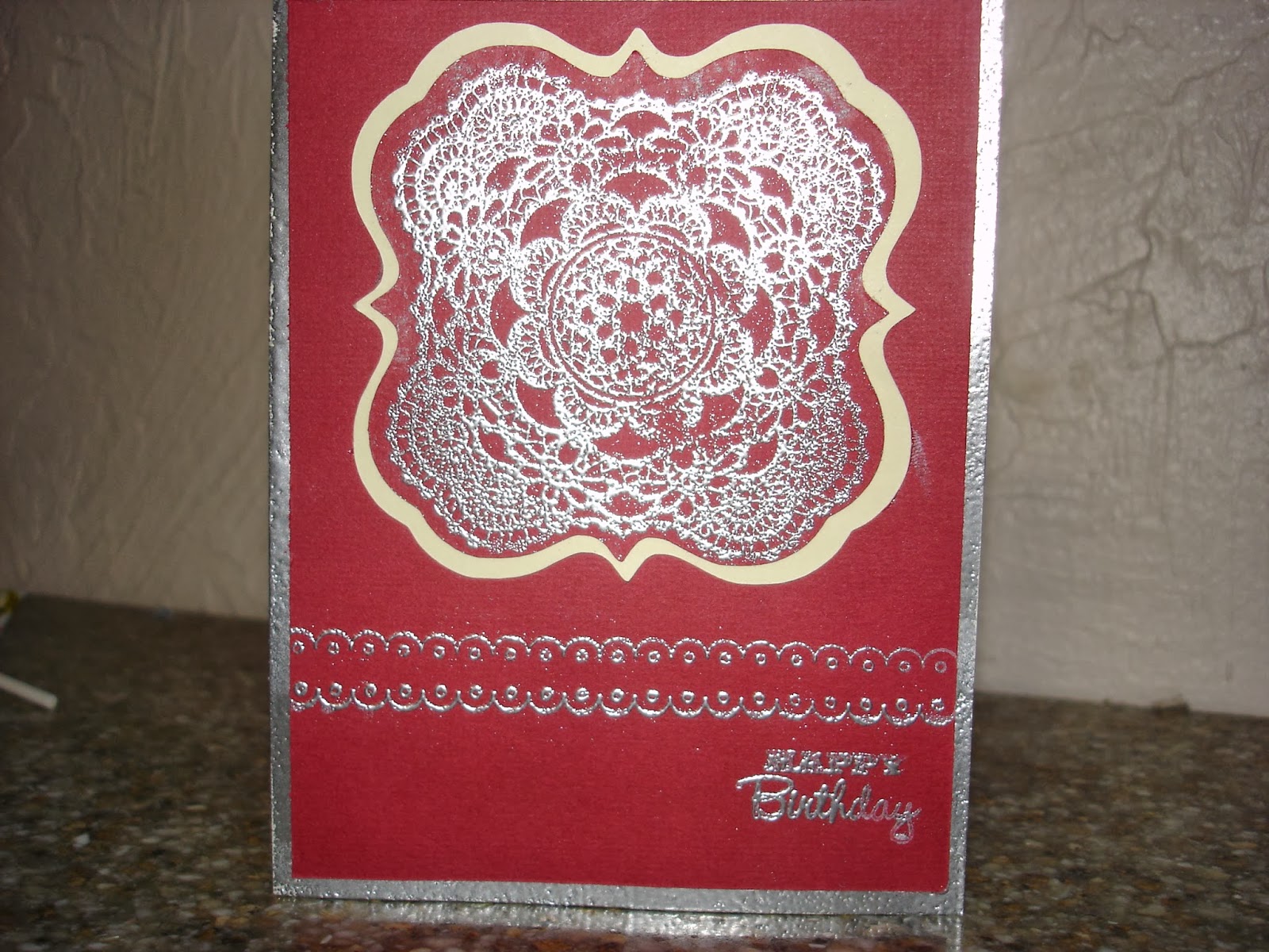 The small wavy border, on the lower portion of the card, was also stamped and embossed with the silver powder. The border stamp is Baby from Fiskars. I used the silver powder on the images and edges of the base card to have all the silver coordinate on the card. The card is an A2 size. Now, I need to make sure she doesn't see this on my blog...
