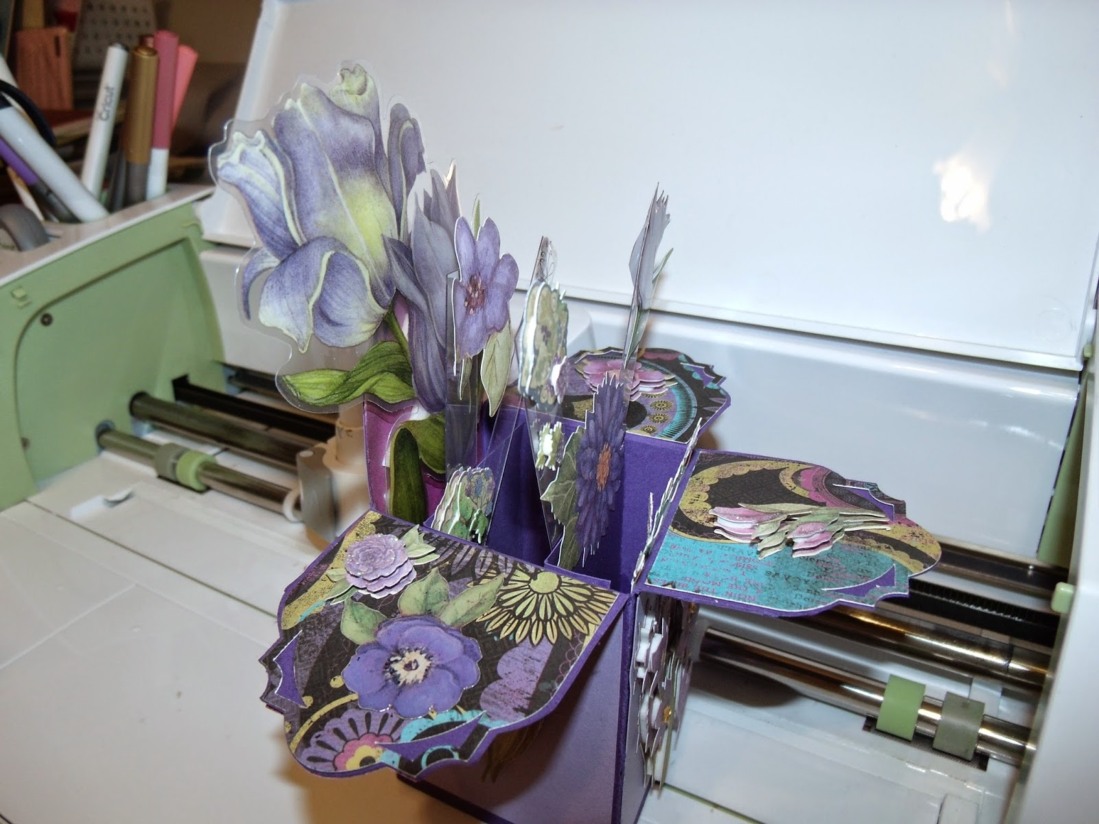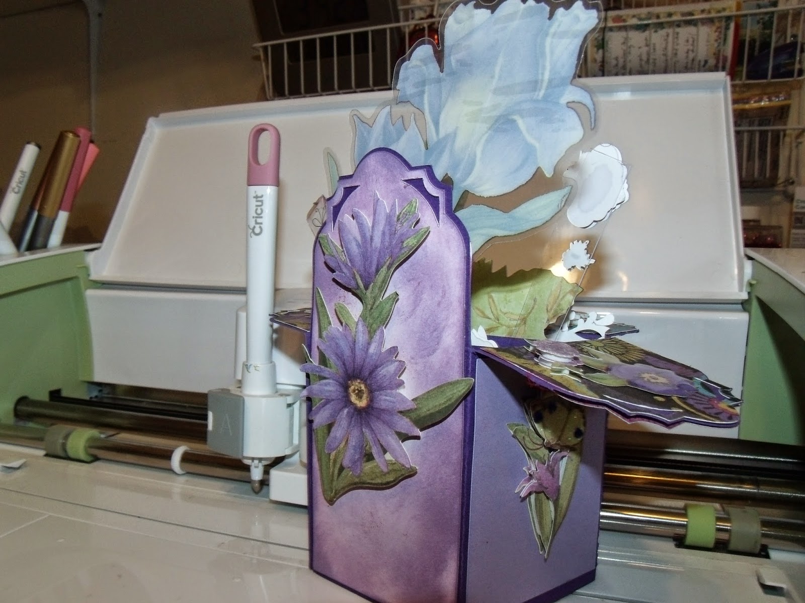 This box card is made in Design Space with Elegant Edges by welding a few rectangles together. I used K&Company embellishments adhered to Close to My Heart card stock. I love my Cricut Explore. This is the 5th box card I have made. On the backside of the box card, I used alcohol inks with a 3-D embellishment from K&Company.
