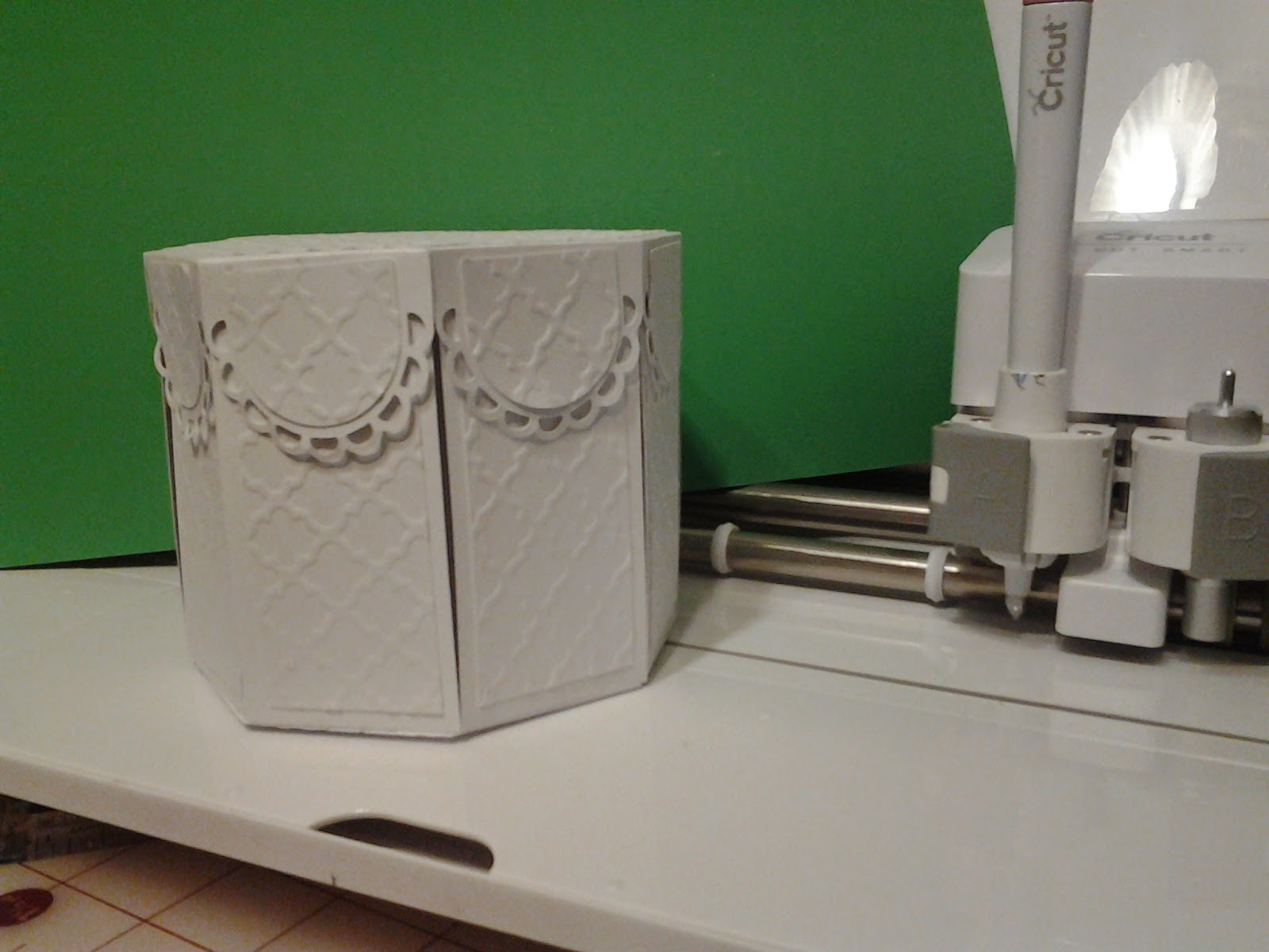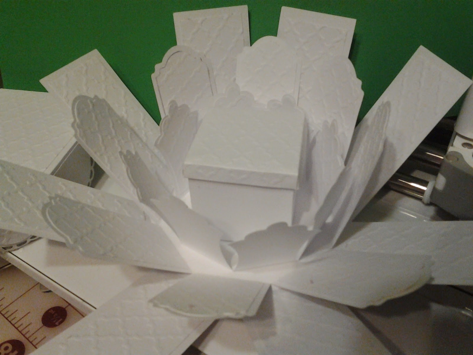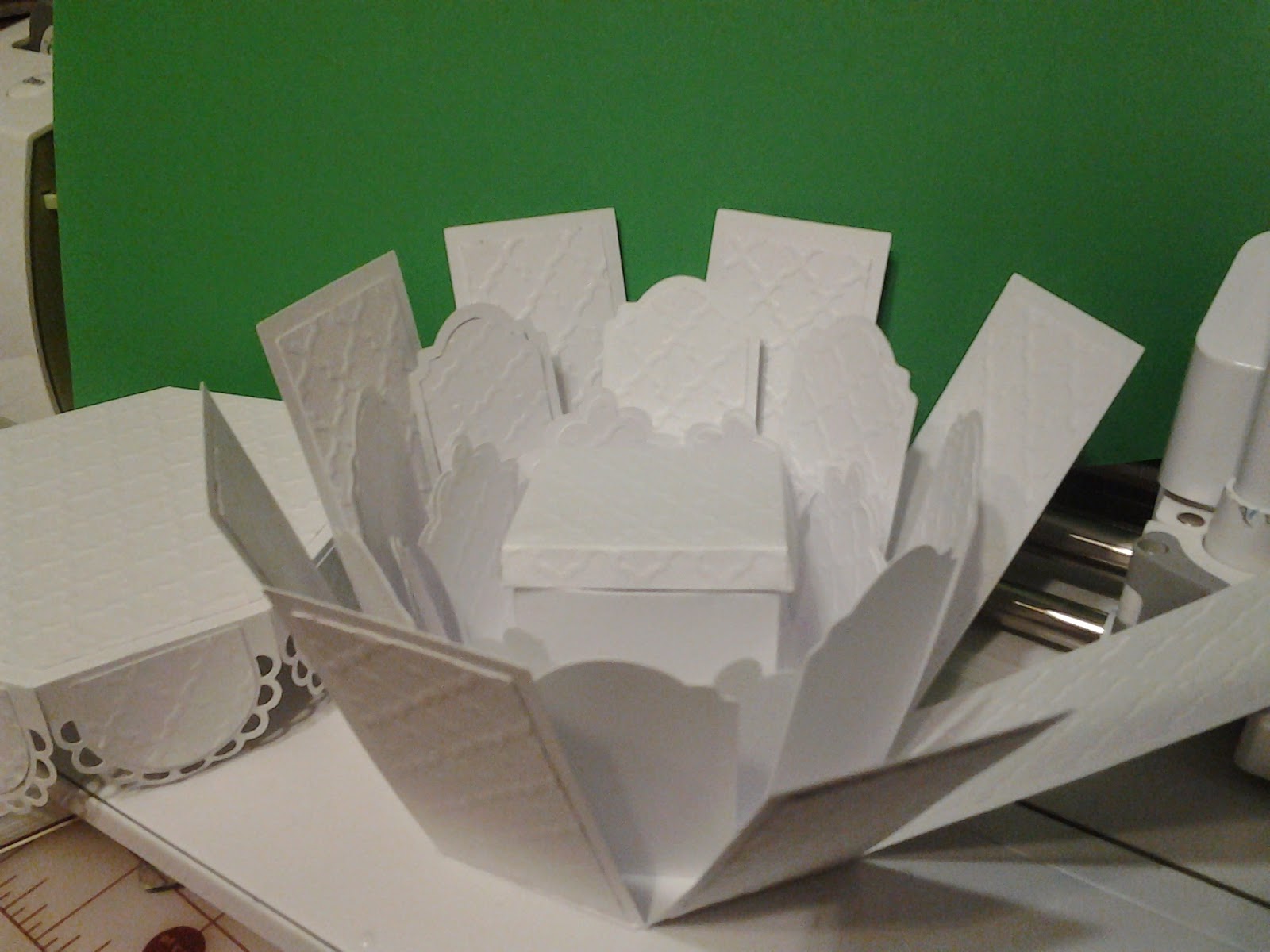 I saw an explosion box card on Cricut Lovers Guide to Design Space. The file is also on that Face Book page. I used the Paper Studio embossing card for the overlay on the box card. The embossing is somewhat hard to view. The design is a frilly trellis. I chose white paper because this box card is for a wedding gift. I love my Cricut Explore.