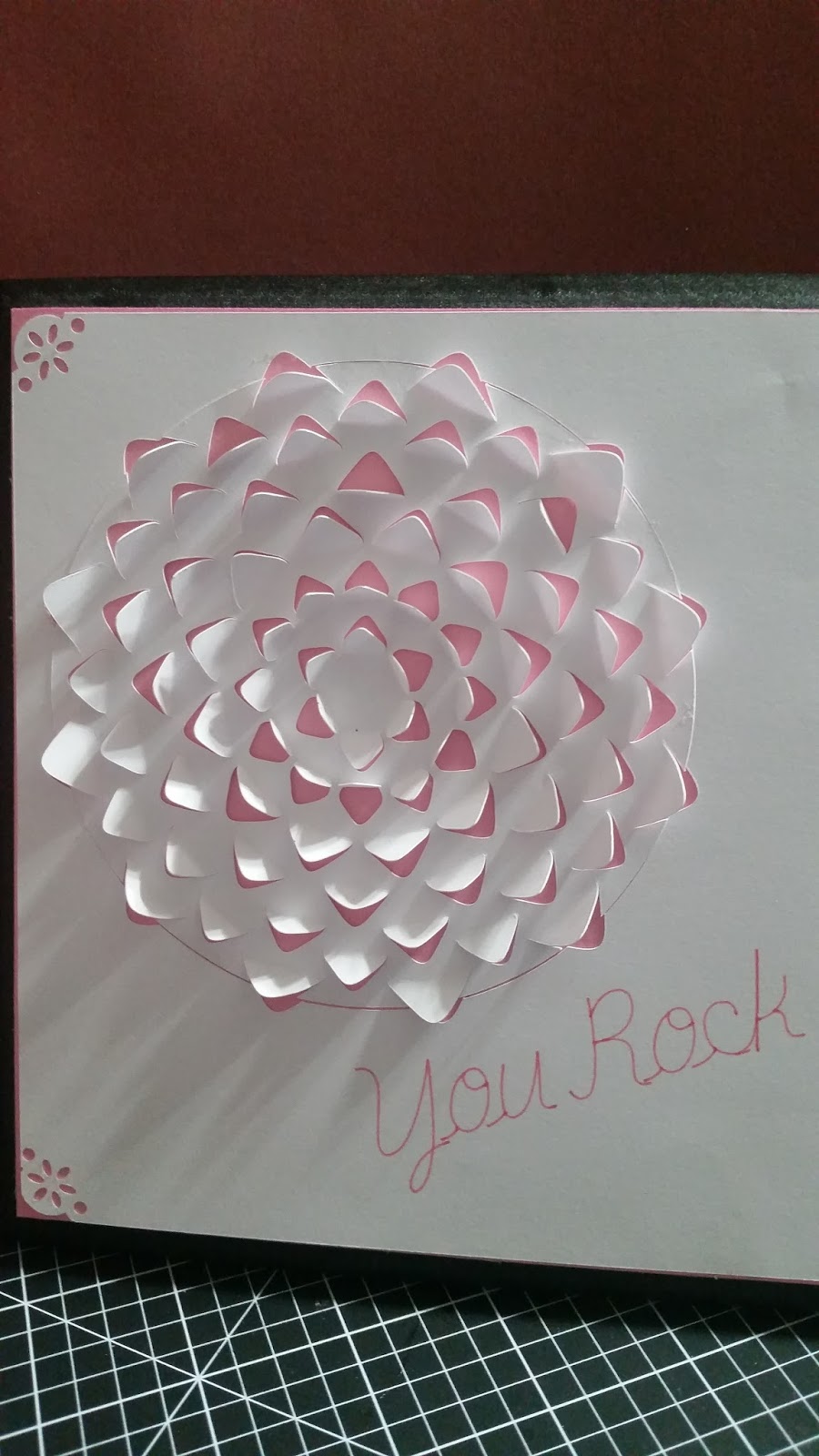 I made this for a teacher friend. I used my Cricut Explore with the Dimensional Paper cartridge. This is just white smooth card stock. I used the text box (in Design Space) to write "YOU ROCK" with the Cricut Pink Crystal pen. I then, attached the phrase to a rectangle shape, attached the 3 D flower shape to the rectangle shape. Hit 'Go' and watched the magic happen. I used a corner punch, adhered the white to a pink back. Then attached the paper to a 5" X 5" wooden frame. This is really very cute.